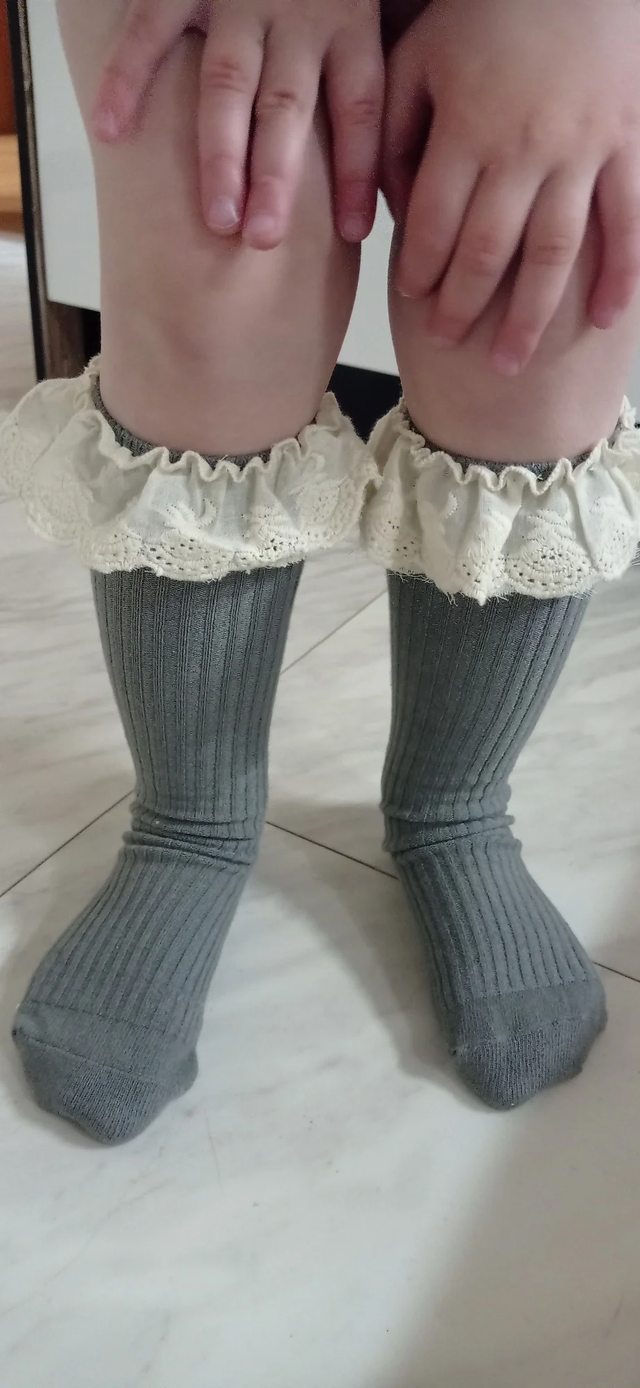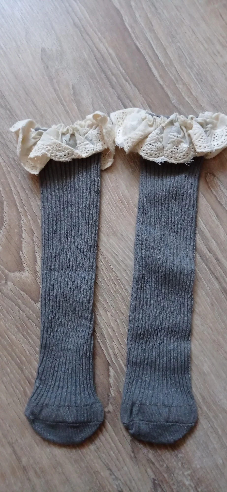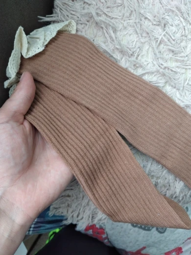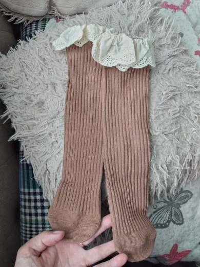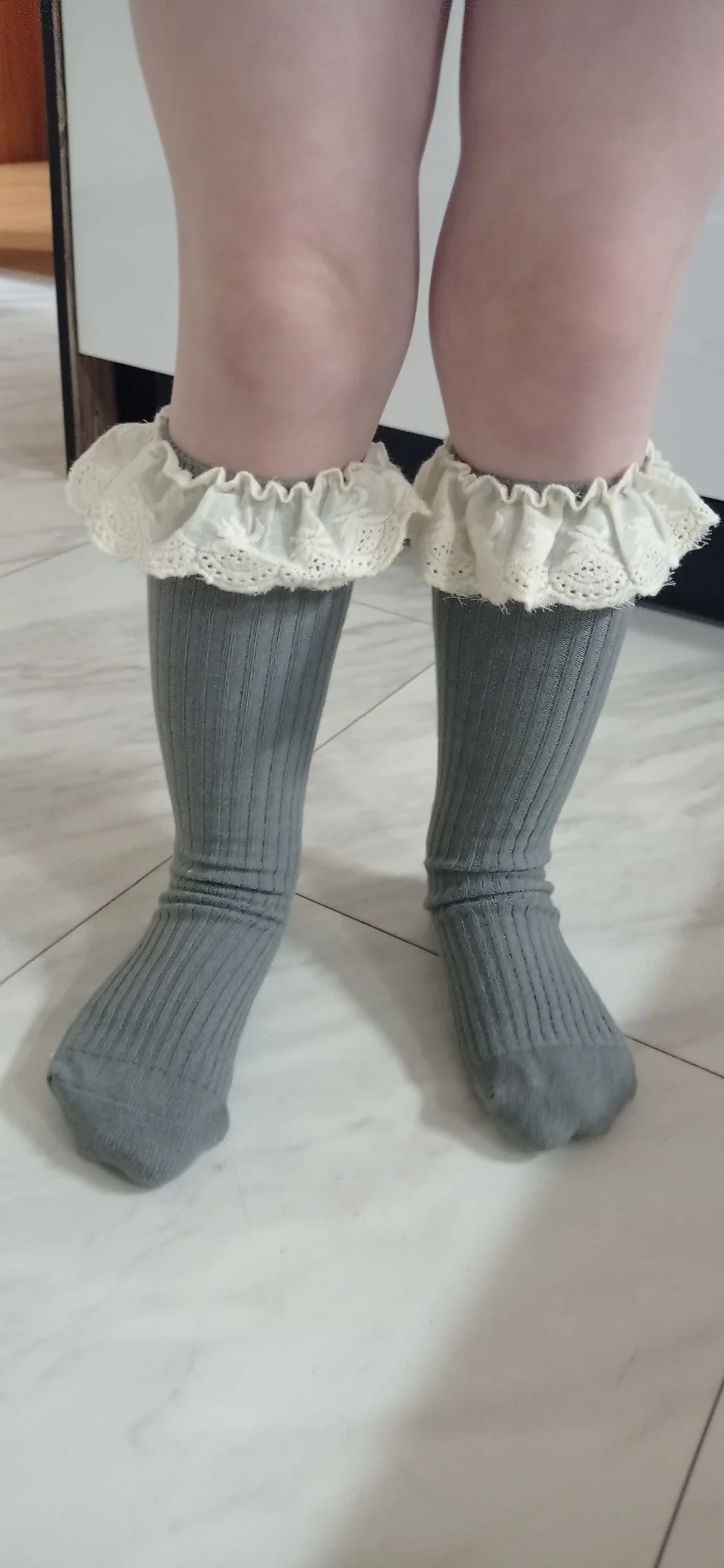 Delivery to RB about 3 weeks. I liked the socks! In the photo girl 14,5 kg, height 95 cm, 2,5 years old. When walking, they crawl. And a little distressed by the untreated cuts on the ruffles. Mouse-gray color))