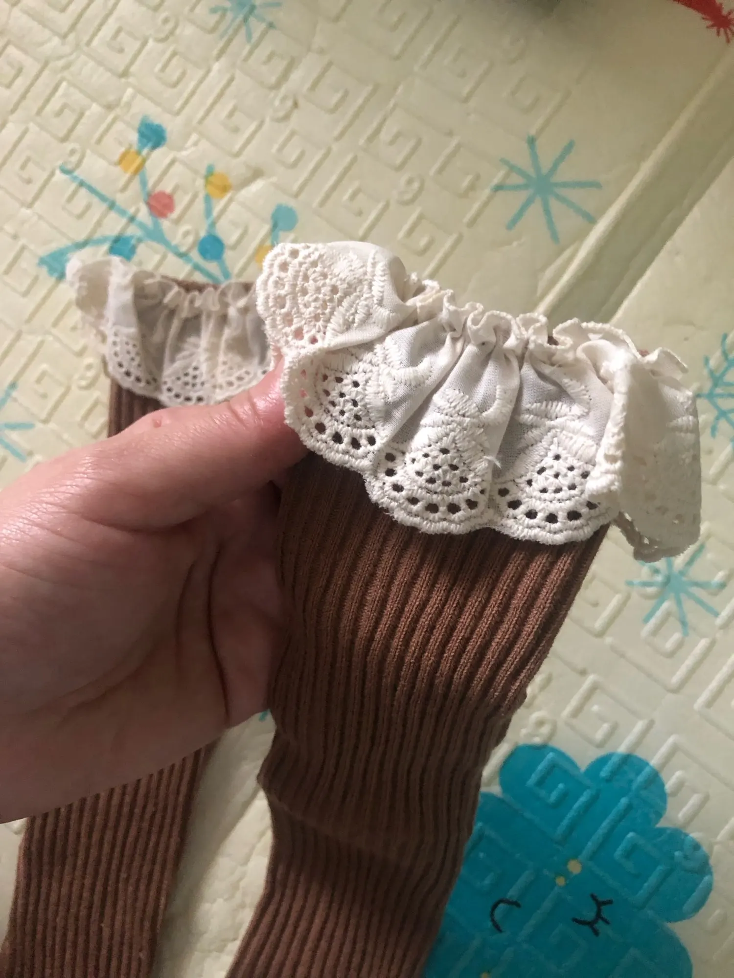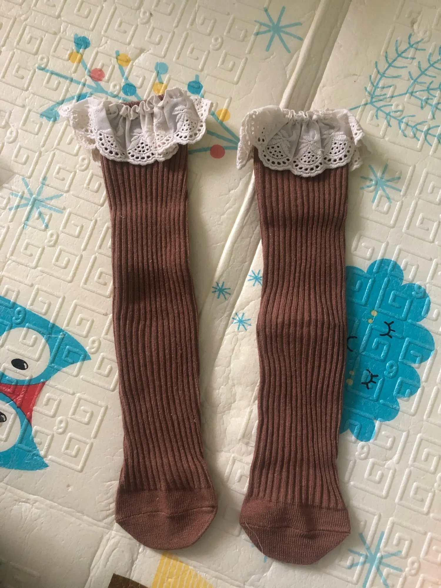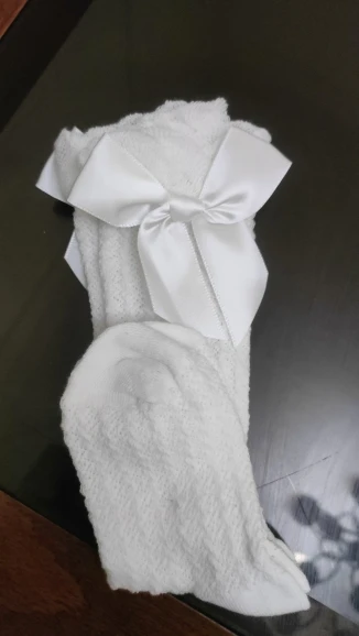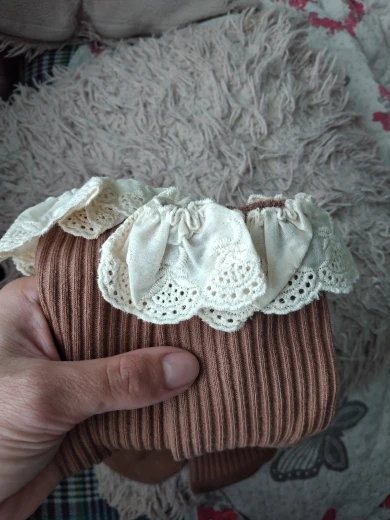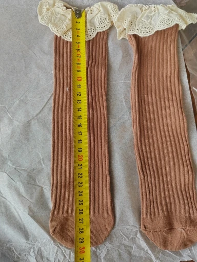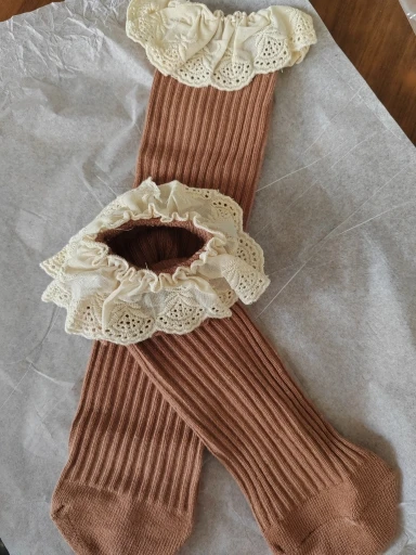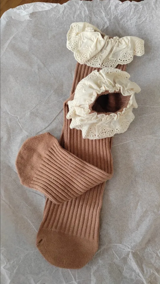 Delivery to RB about 3 weeks. I liked the socks! In the photo girl 14,5 kg, height 95 cm, 2,5 years old. When walking, they crawl. And a little distressed by the untreated cuts on the ruffles. Mouse-gray color))
