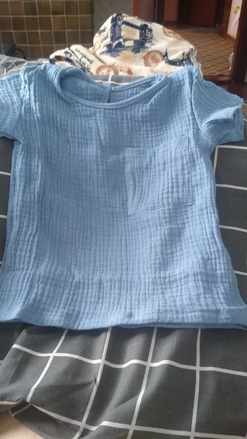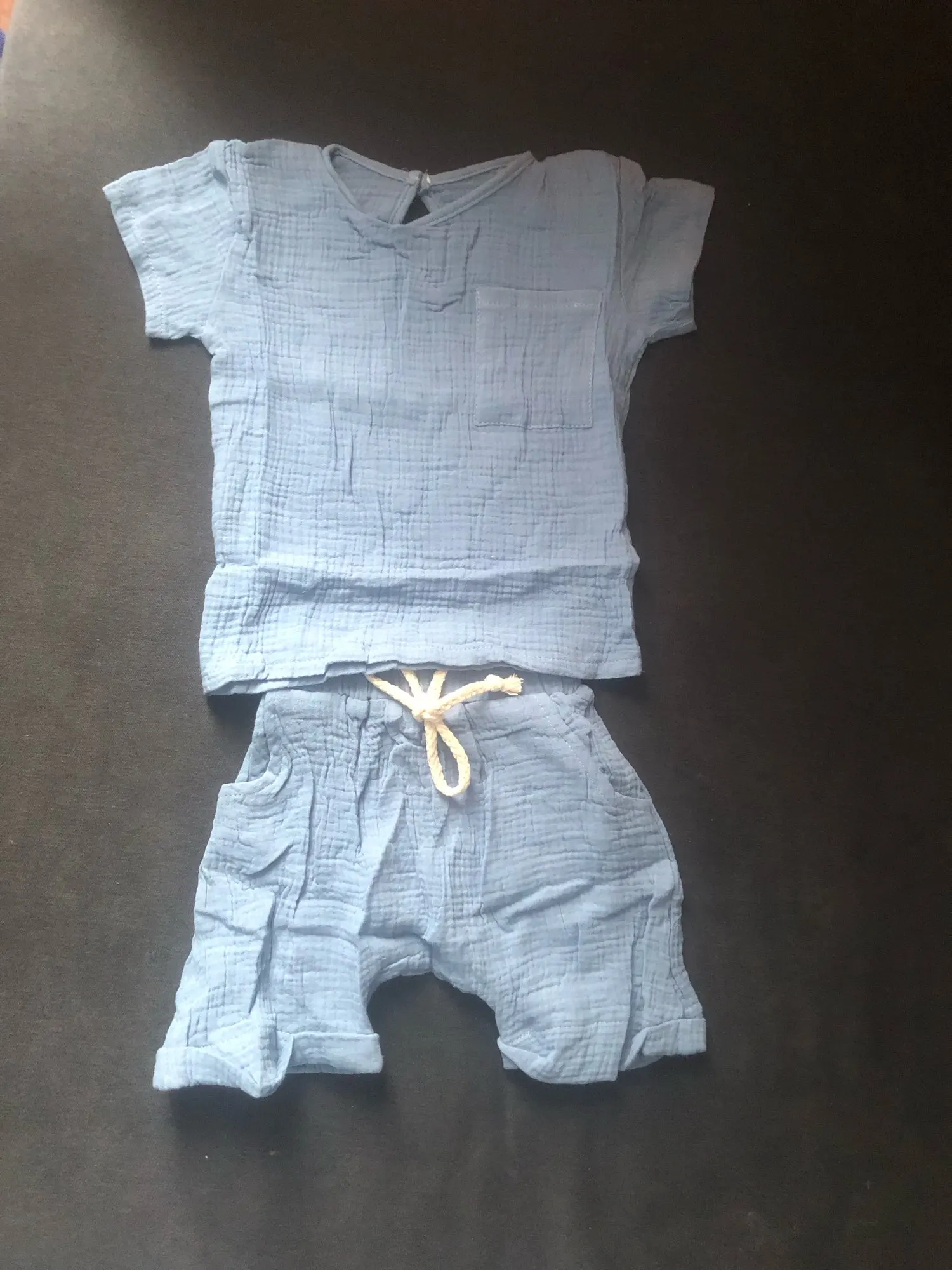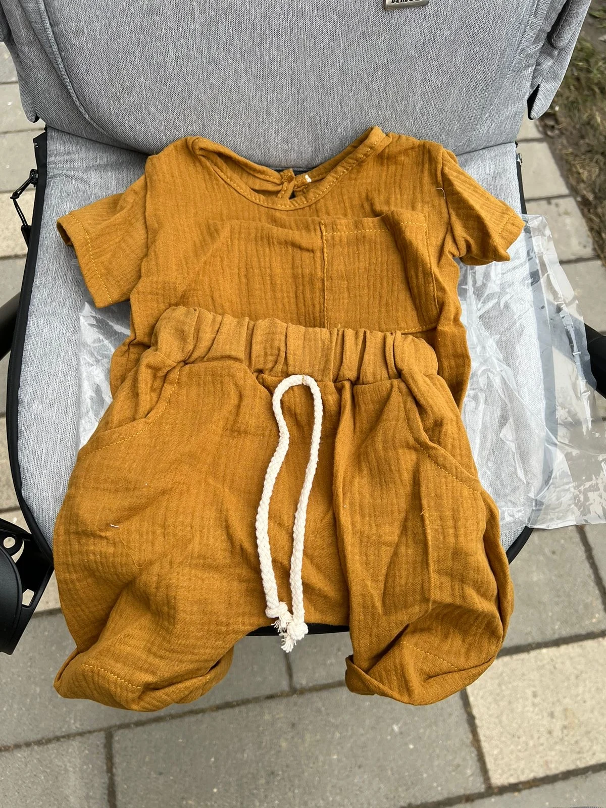 Great kit! The quality is super. Light, pleasant to the touch of muslin. For the summer will be the very thing! Super! Child 9 months, 74 cm height. The elastic band on the pants is a little tight, but it's not scary. The delivery is fast. Thank you!